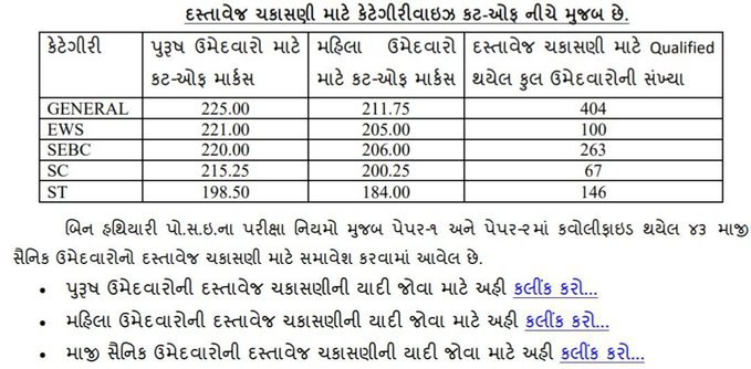 જે ઉમેદવારો આ કટ-ઓફ મુજબ ક્વોલિફાઈ થયા છે, તેમણે Document Verification માટે જરૂરી તમામ દસ્તાવેજો સમયસર તૈયાર રાખવા જરૂરી છે. DV દરમિયાન કોઈપણ દસ્તાવેજમાં ખામી હોય તો આગળની પ્રક્રિયામાં અડચણ આવી શકે છે.